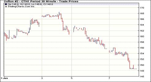 6月7日紐約期棉延續(xù)前一日跌勢(shì),繼續(xù)下行,因缺乏支撐及基本面利空,前三個(gè)合約收于跌停板。當(dāng)日市場(chǎng)小幅低開(kāi),早盤(pán)一度微幅走高,近期7月合約最高至156.00美分/磅,12月合約至137.28美分/磅。隨后期棉遭到賣(mài)盤(pán)打壓,快速下滑,7月合約跌破150美分/磅關(guān)鍵支撐位。盤(pán)終前三個(gè)合約跌停,7月合約收于148.63美分/磅,跌700點(diǎn);12月合約收于129.93美分/磅,跌700點(diǎn);遠(yuǎn)期合約相對(duì)強(qiáng)勢(shì),跌幅較小。當(dāng)日7月至12月的轉(zhuǎn)倉(cāng)交易以及指數(shù)基金平倉(cāng)依舊活躍。另外投資者預(yù)期美國(guó)農(nóng)業(yè)部(USDA)6月的預(yù)測(cè)報(bào)告中可能調(diào)低美棉的出口量,因?yàn)榻?0周來(lái),陸地棉凈簽約情況不甚樂(lè)觀(guān),均為負(fù)數(shù)。