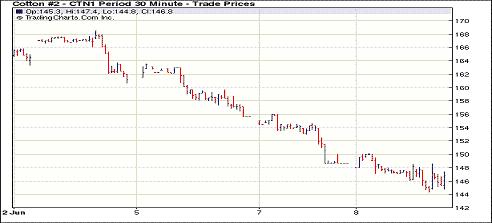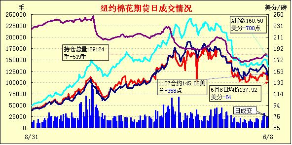6月8日紐約期棉成交活躍,近期合約缺乏支撐,大幅收跌,遠期合約表現(xiàn)強勢。當日市場開盤后近期7月合約多數(shù)時間在低位震蕩,且最低至144.31美分/磅。12月合約最低點為136.57美分/磅,后受到轉(zhuǎn)倉交易的支撐,出現(xiàn)反彈。盤終7月合約收于145.05美分/磅,跌358點;12月合約收于130.15美分/磅,漲22點。目前投資者正在等待方向指引,即本周四的美棉出口周報及美國農(nóng)業(yè)部(USDA)最新的供求預測報告,目前本年度美國陸地棉凈簽約已連續(xù)10周為負值,累計取消的簽約及回購的數(shù)量已超過35萬包(7.6萬噸)。