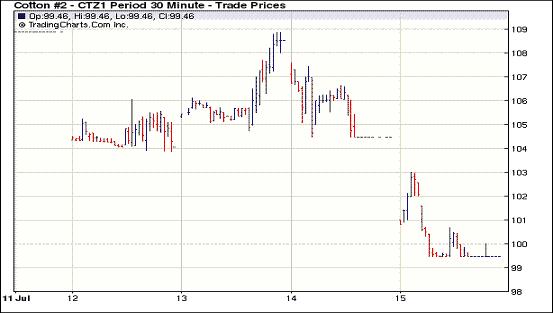 7月14日紐約期棉在基本面美棉出口周報(bào)利空、技術(shù)面壓力和經(jīng)濟(jì)層面三重壓力下前四份合約跌停,其他合約亦大幅收跌,近期10月合約結(jié)算價(jià)106.35美分,主力12月合約104.46美分,1203月合約跌破1美元,收于99.63美分。雖然前一日市場(chǎng)大幅反彈,但14日期棉市場(chǎng)在短暫的平穩(wěn)開(kāi)盤(pán)后呈現(xiàn)跌勢(shì)。從市場(chǎng)動(dòng)態(tài)來(lái)看,美聯(lián)儲(chǔ)主席本-伯南克表示央行不準(zhǔn)備立即推出新的刺激經(jīng)濟(jì)增長(zhǎng)措施,令投資者感到失望,美國(guó)股市和商品市場(chǎng)整體承壓;美棉出口周報(bào)顯示上周美國(guó)本年度陸地棉凈簽約量為負(fù)值;外加技術(shù)面的連續(xù)破位下跌,期棉市場(chǎng)悲觀氣氛加重,最終以全面大跌收盤(pán)。