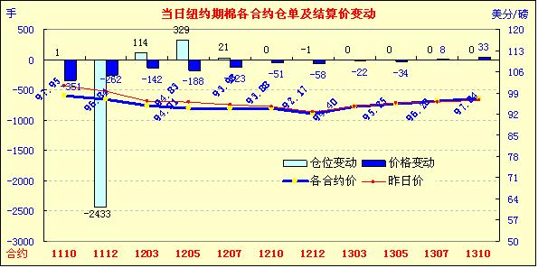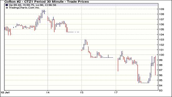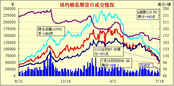 7月18日紐約期棉繼續(xù)下跌,近期10月合約收于97.95美分/磅,跌351點;主力12月合約96.84美分,跌262點。外部股市和商品市場整體走弱,期棉一并承壓。當日市場在經(jīng)濟層面壓力下美元上漲,美國股市和商品市場有所下跌,期棉上半場窄幅震蕩后盤中驟跌并再現(xiàn)跌停。周一投資者們既擔心歐洲債務(wù)危機,也擔心美國的提高債務(wù)上限談判沒有進展,給市場帶來壓力。后有買盤介入促使市場回補部分跌幅,12月合約在震蕩中收跌200余點。