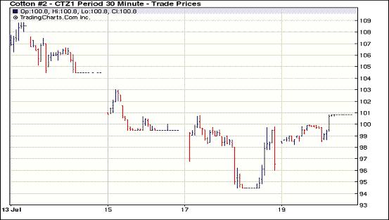 7月19日,紐約期棉在美國股市上漲和美元下跌,以及技術(shù)面超跌反彈作用下全面漲停,近期10月合約結(jié)算價(jià)101.95美分/磅,主力12月合約重回1美元,結(jié)算價(jià)100.84美分/磅。當(dāng)日12月合約早盤在98-99美分間弱勢震蕩,盤中欲沖破100美分失敗后調(diào)頭向下。奧巴馬總統(tǒng)透露有關(guān)提高美國債務(wù)上限的談判取得重要進(jìn)展,以及IBM等公司的財(cái)報(bào)好于市場預(yù)期等消息刺激美元下跌及股市大漲,原油和其他商品市場整體反彈,促進(jìn)期棉后市走高,加上技術(shù)面超賣有反彈需求,期棉最終收于漲停。