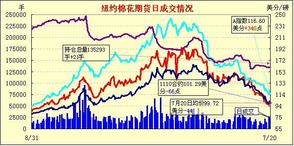 7月20日紐約期棉全面下跌,近期10月合約收于101.29美分/磅,跌66點,主力12月合約100.75美分,跌9點。因缺乏買盤跟進(jìn),市場未能延續(xù)前一日強勢。當(dāng)日12月合約小幅高開后在100美分以上掙扎,早盤跌破該水平低位徘徊,后雖有買盤推動該合約挑戰(zhàn)102美分,外部商品市場漲跌不一,期棉市場缺乏足夠買盤跟進(jìn)調(diào)頭向下,在回跌至98美分一線后回彈,最終以微跌收盤。本周四美國農(nóng)業(yè)部(USDA)將發(fā)布的美棉出口周報中美棉可能繼續(xù)有取消,對市場形成一定壓力。