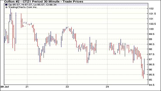 7月25日受經(jīng)濟(jì)層面美國債務(wù)問題及外部商品市場整體下跌影響,紐約期棉全面收跌,近期10月合約收于97.09美分/磅,跌205點(diǎn),主力1112月合約96.76美分,跌188點(diǎn)。當(dāng)日12月合約早盤窄幅震蕩,后受賣盤打壓向96.5美分靠攏,技術(shù)面支持該合約穩(wěn)于此水平線以上,但交易后期因經(jīng)濟(jì)層面壓力及外部商品市場下跌拖累,12月合約洞穿96.5的支撐位,最低跌至95.13美分,交易尾段獲少量買盤支持從低點(diǎn)反彈,最終收于96.76美分。奧巴馬總統(tǒng)周末與國會共和黨之間的談判破裂,未能就提高美國債務(wù)上限達(dá)成協(xié)議,引發(fā)人們對美國信用評級將遭下調(diào)的恐懼。受有利降雨影響,外部商品市場CBOT玉米、大豆和小麥期貨均收跌。