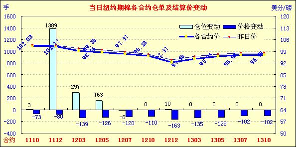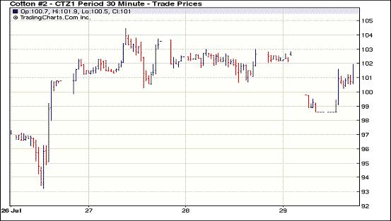 7月29日紐約期棉市場為2010/11國際棉花年度最后一個交易日,市場經(jīng)歷劇烈波動后繼續(xù)收跌,近期10月合約收于102.08美分,跌73點,主力12月合約101.77,跌80點。近期12月合約圍繞1美元波動,年度最終,12月合約堅守住了1美元。當日市場低開低走,受經(jīng)濟層面和技術面壓力,期棉破位下跌,投資者擔心美國國會遲遲不能解決債務危機問題將殃及美國經(jīng)濟,主要商品市場承壓,12月合約最低觸及跌停(-400點)。但市場低點獲買盤支持,跌停板被打開后回彈至1美元之上,交易后期于101美分一線窄幅波動。