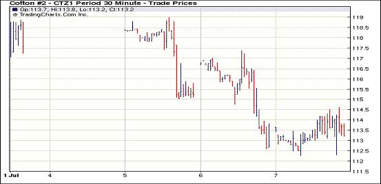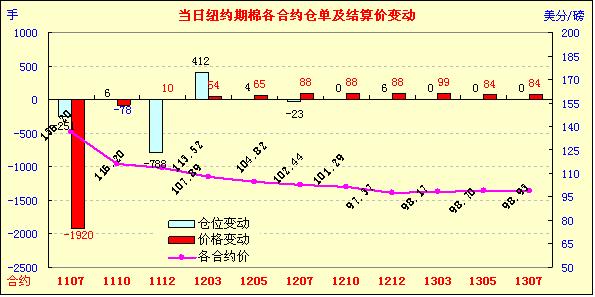 7月7日,紐約期棉除前兩份合約下跌,其他合約小幅上漲,結束連續(xù)陰跌勢頭。當日為7月合約最后交易日,結算價136.2美分/磅,跌1920點(進入交割期合約不受漲跌停板限制),主力1112月合約113.52美分,漲10點。當日12月合約平開后短暫上揚,因缺乏積極買盤跌破開盤水平,最低價跌至112.26美分,為1月31日(五個多月)以來最低水平。后期賣盤未加大打壓力度,市場觸底反彈,12月合約微幅收漲。內外基本面因素對期棉市場形成壓力,一方面美棉出口周報周五發(fā)布,美棉可能仍有合同取消,目前棉花出口裝運進度不盡人意,并且市場預期7月的美國農業(yè)部供需報告中或將調低美棉出口量;另一方面,全球紡織行業(yè)行情不濟,需求陷入疲態(tài),暫無明顯好轉痕跡。