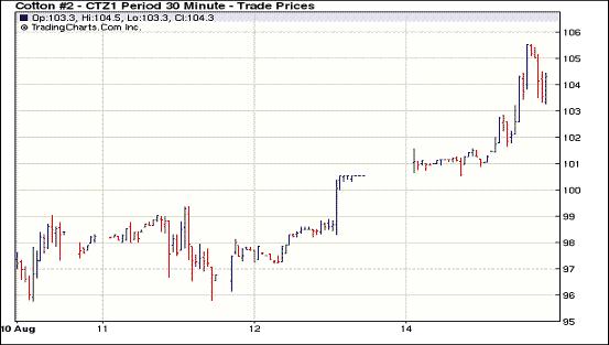 8月15日,受美元疲軟的提振,當(dāng)日外圍商品市場普遍走強(qiáng),紐約期棉近強(qiáng)遠(yuǎn)弱,前兩個合約盤中觸漲停板并收于高點。當(dāng)日棉市承接前一日漲勢,早盤小幅高開,后有所回落。后半場期棉受到買盤支撐,穩(wěn)步走高,1110月合約和1112月合約分別達(dá)到500點漲停板105.72美分/磅和105.52美分/磅,接近尾盤時有所回落,盤終1110月合約收于105.03美分/磅,漲431點;1112月合約收于104.04美分/磅,漲352點;遠(yuǎn)期合約相對弱勢,部分收跌。