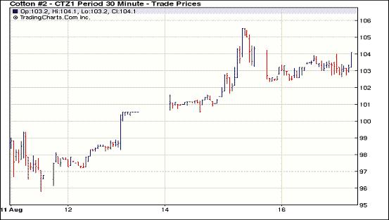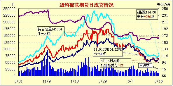 在連續(xù)兩天連續(xù)大漲之后,8月16日紐約期棉在市場(chǎng)缺乏方向指引,部分獲利回吐賣盤的打壓下,多數(shù)合約小幅收跌,市場(chǎng)觀望氣氛濃厚,成交清淡。當(dāng)日市場(chǎng)平穩(wěn)開(kāi)盤,主力1112月合約窄幅震蕩,盤中最高至104.24美分/磅,后受到賣盤打壓,價(jià)格回落至最低102.36美分/磅,最終收于103.85美分/磅,跌19點(diǎn)。近期1110月合約收于104.62美分/磅,跌41點(diǎn)。除1207月合約外,其它合約均小幅收跌。此前兩日(周五及周一),期棉1112月合約累計(jì)漲幅達(dá)到752點(diǎn)。