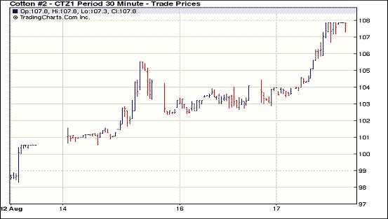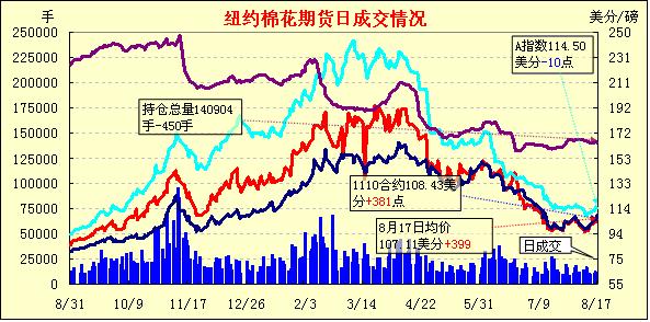 經(jīng)過周二小幅回調(diào)之后,8月17日紐約期棉強勢上揚,主力1112月合約觸及漲停板,并收于高位;當(dāng)日成交量明顯增加。當(dāng)日市場開盤后受技術(shù)買盤支撐一路走強,主力1112月合約達(dá)到本周一高點105.52美分/磅時觸發(fā)止損買盤,促價格進(jìn)一步上揚,直至當(dāng)日漲停板107.85美分/磅;后價格小幅回落,盤終再度反彈,收于107.82美分/磅,漲幅397點。近期1110月合約收于108.43美分/磅,漲381點。當(dāng)日商品市場受美元疲軟的提振,普遍走強。