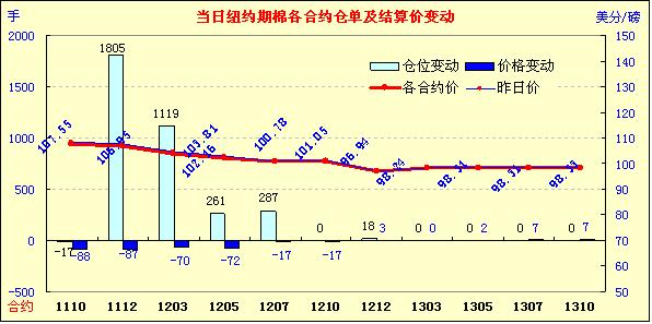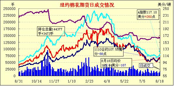 8月18日紐約期棉未能承接前一日漲勢,因基本面打壓及外圍市場拖拽而中幅收跌,主力合約盤中觸及跌停板。當日市場早盤短時間小幅走高,1112月合約最高至108.00美分/磅,之后受到投機賣盤的打壓,很快回落,且最低至400點跌停板103.82美分/磅;尾盤時在部分買盤支持下有所反彈,盤終收于106.95美分/磅,跌87點。近期1110月合約收于107.55美分/磅,跌88點。1212月之后的遠期合約相對強勢,微幅收漲。當日美元指數(shù)走強,整個商品市場及股市承壓,拖棉花期貨市場造成打壓。此外周四的美棉出口周報顯示中國大量取消11/12年度陸地棉簽約(凈簽約負的7.7萬噸),而增加12/13年度的簽約對主力合約形成壓力。