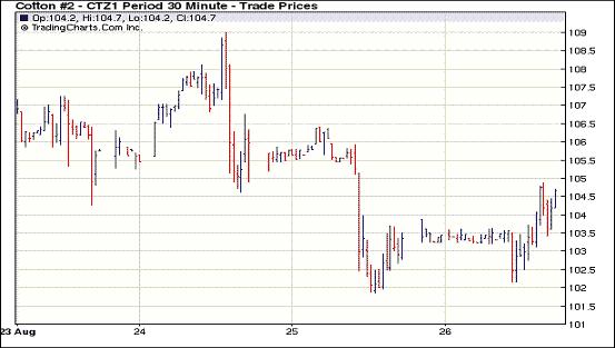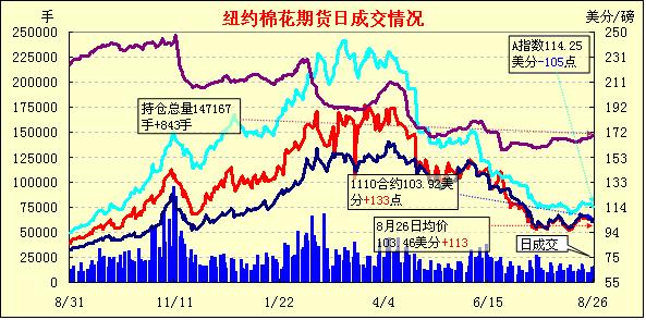 8月26日,受美聯(lián)儲主席伯南克將推出更多經(jīng)濟(jì)刺激舉措講話影響,全球股市大漲,美元下挫,投資者的買盤增多,紐約期棉結(jié)束了“三連跌”,近期合約全線漲百點(diǎn)以上,12月合約期約報(bào)收于103.92美分,升133點(diǎn)。