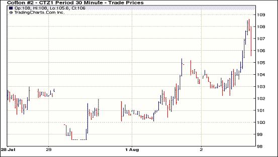 8月2日紐約期棉大幅波動(dòng),主力合約受到投機(jī)買盤支持再度收漲,遠(yuǎn)期合約漲跌不一。當(dāng)日期棉早盤未能承接前一日漲勢(shì),上半場(chǎng)成交清淡,弱勢(shì)下跌,主力12月合約最低至102.25美分/磅。下半場(chǎng)投機(jī)基金買盤及技術(shù)買盤發(fā)力,主力合約低點(diǎn)反彈,并大幅攀高至108.62美分/磅,接近當(dāng)日漲停板108.85美分/磅。后買盤撤離,該合約回吐部分漲幅,收于106.85美分/磅,漲180點(diǎn),當(dāng)日波動(dòng)幅度達(dá)到637點(diǎn)。近期10月合約收于107.17美分/磅,漲158點(diǎn);其它遠(yuǎn)期合約普遍小幅收跌。