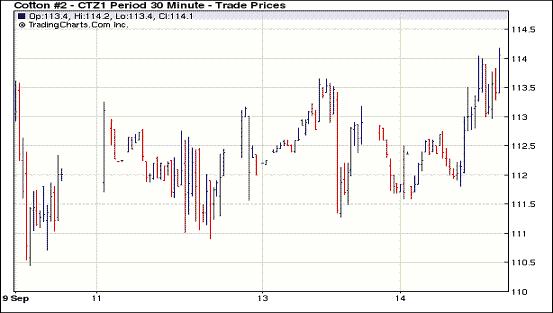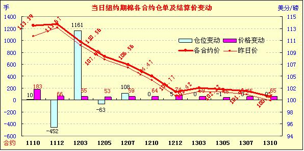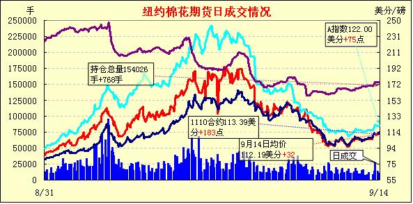 9月14日,紐約期棉在美棉苗情整體較差及中國8月份進(jìn)口增加的利好因素支撐下再度全面收漲,近期1110月合約結(jié)算價(jià)113.39美分/磅,漲183點(diǎn),主力1112月合約結(jié)算價(jià)113.67美分/磅,漲66點(diǎn)。市場在本周一美國農(nóng)業(yè)部(USDA)全球供需報(bào)告公布之后缺乏方向指引,交易商仍普遍持觀望態(tài)度,成交較為清淡。當(dāng)日市場早盤震蕩走低,主力1112月合約達(dá)當(dāng)日低點(diǎn)111.59美分/磅;后獲受買盤支撐期棉快速上揚(yáng),主力合約超過前兩日區(qū)間至當(dāng)日最高點(diǎn)114.18美分/磅,震蕩幅度達(dá)269點(diǎn);尾盤時(shí)買盤撤退回吐部分漲幅,盤終主力合約中幅收漲,其他月份合約也不同程度上漲。中國8月份棉花進(jìn)口20.7萬噸,雖然同比下降13.8%至,但較7月份增加31.8%,這是促使市場上漲的一個(gè)重要原因。