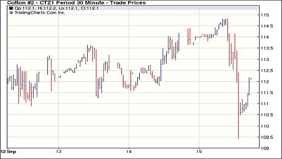在美棉出口出現(xiàn)負(fù)值的利空因素打壓下,9月15日紐約期棉結(jié)束之前3個(gè)交易日連漲局面全面下跌,近期1110月合約結(jié)算價(jià)110.62美分/磅,跌277點(diǎn),主力1112月合約結(jié)算價(jià)111.62美分/磅,跌205點(diǎn),其他遠(yuǎn)期合約也不同程度收跌。當(dāng)日主力1112月合約早盤震蕩上揚(yáng),最高點(diǎn)至114.83美分/磅(+116點(diǎn));后由于美棉出口周報(bào)數(shù)據(jù)不佳導(dǎo)致賣盤大量涌入,市場急速下跌,近期合約跌幅普遍超過300點(diǎn),主力合約跌至當(dāng)日最低點(diǎn)109.42美分/磅,震蕩幅度達(dá)541點(diǎn);尾盤在買盤支撐下稍有回升,盤終大幅收跌。據(jù)美國農(nóng)業(yè)部(USDA),9.2-9.8一周美國凈簽約出口本年度陸地棉負(fù)的38850噸,裝運(yùn)14470噸;當(dāng)周中國凈簽約本年度陸地棉負(fù)的45609噸(新簽2563噸,轉(zhuǎn)簽318噸,取消簽約48489噸)。