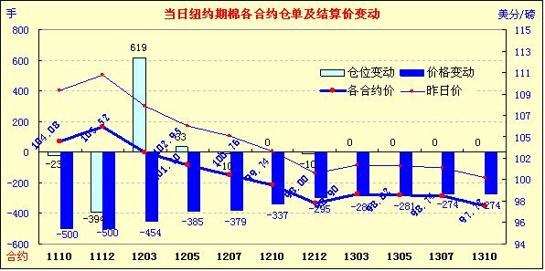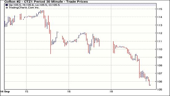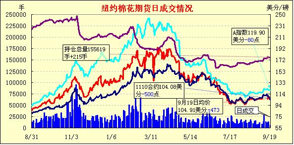 因美元指數(shù)強(qiáng)勁、外部商品市場(chǎng)不振,9月19日紐約期棉受賣(mài)盤(pán)打壓全面大幅收跌,近期1110月合約結(jié)算價(jià)104.08美分/磅,跌500點(diǎn),主力1112月合約結(jié)算價(jià)105.52美分/磅,跌500點(diǎn),為三周來(lái)最低點(diǎn)(9月2日105.89美分/磅);當(dāng)日成交量超過(guò)2萬(wàn)手,較前幾個(gè)交易日明顯增加。當(dāng)日市場(chǎng)小幅低開(kāi),因美元指數(shù)走強(qiáng),商品市場(chǎng)整體疲軟,期棉受外圍市場(chǎng)拖拽以及對(duì)全球需求憂慮的影響而震蕩走低,午盤(pán)后賣(mài)盤(pán)涌入致價(jià)格進(jìn)一步回落,尾盤(pán)跌至跌停板并延續(xù)至盤(pán)終。
