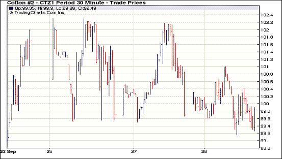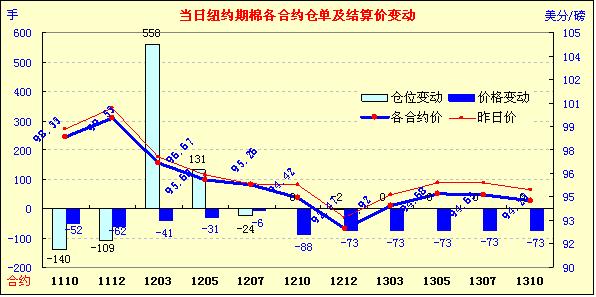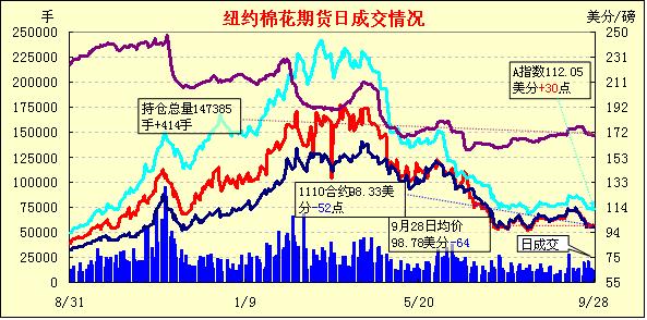 受美元走強、擔心歐債危機再次升級,外圍商品市場走弱等利空因素影響,9月28日,紐約期棉全面收跌,1110月合約結(jié)算價98.33美分/磅,跌52點,主力1112月合約結(jié)算價99.53美分/磅,跌62點。當日市場早盤在買盤支持下震蕩走高,主力合約最高至101.00美分/磅(+85點),未能突破前一日高點102.18美分/磅;后受外圍市場走低打壓買盤撤退,期棉迅速回落;尾盤時買盤再次介入回補部分跌幅,盤終主力合約小幅告跌,其他多數(shù)合約也不同程度 收跌。