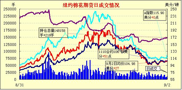 9月2日,紐約期棉前兩份合約小幅上漲,其他合約全面下跌,近期10月合約結(jié)算價106.59美分/磅,漲51點,主力12月合約105.89美分,漲11點。雖然美國墨西哥灣再度生成風(fēng)暴對美國南部棉花形成威脅,但美國8月非農(nóng)就業(yè)不盡人意,市場承受一定壓力。當(dāng)日市場穩(wěn)開高走,主力12月合約再度沖向107美分的關(guān)鍵阻力位,但因美國8月非農(nóng)就業(yè)增幅為零,令投資者擔(dān)心美國經(jīng)濟將受到更多國會黨派爭斗的拖累;多家大型銀行面臨政府起訴,經(jīng)濟方面壓力迫使期棉受外部原油期貨和股市等市場不振影響高位下滑,當(dāng)主力合約最低跌至105.01美分時獲買盤支持,交易后期窄幅波動,微幅收漲。