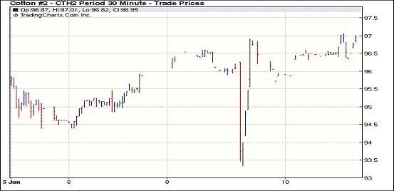 1月10日,因美元走低、美股及原油期貨走高,市場整體人氣樂觀,紐約期棉受提振繼續(xù)收漲,近期3月合約結算價達到近兩個月以來高點,當日收于96.96美分/磅,漲52點,5月合約96.52美分,漲40點。市場當日交易整體平淡,近期3月合約早盤在95.5-96美分間窄幅波動,盤中在96.5左右波動,交易尾段在96.5-97美分間徘徊,最終收于近7周高點。因美國業(yè)績期開局良好和海外市場大幅上揚提振了投資者人氣,昨日美國股市及原油期貨收漲,藍籌股收于去年7月底以來最高水平,市場整體人氣樂觀,紐約期棉受提振繼續(xù)延續(xù)漲勢。此外,基金調倉、美國2012/13年植棉面積或下降及美國棉區(qū)干旱繼續(xù)對期棉形成支撐。