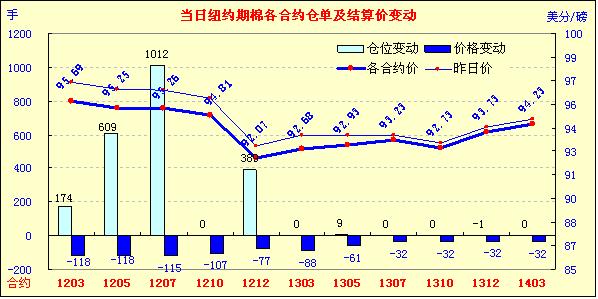 1月12日,雖然美棉出口對期棉形成一定支撐,但因美國農(nóng)業(yè)部(USDA)公布的全球最新供需預測報告中棉花消費量大幅調(diào)減及期末庫存調(diào)增,ICE期棉承壓全面收跌,主力1203月合約結算價95.69美分/磅,跌118點,1205月合約結算價95.25美分/磅,跌118點,其他遠期合約跌幅32-115點不等。當日市場早盤在96.5-97.5美分/磅之間窄幅震蕩,后全球供需預測報告利空對期棉形成打壓,主力1203月合約快速最低至當日最低點94.13美分/磅;美棉出口尚可促買盤涌入回補部分跌幅,盤終該合約收跌百余點。當日外部谷物及油料市場也普遍大幅收跌。12.30-1.5一周美國凈簽約出口本年度陸地棉21047噸,裝運35947噸(較前一周增6%,較近四周平均值減10%),這對期棉形成一定支撐。但基本面上消費疲軟(據(jù)美國農(nóng)業(yè)部最新預測報告顯示,本年度全球棉花產(chǎn)量2675萬噸,相比12月預測調(diào)減了13萬噸;全球消費量2395萬,調(diào)減29萬噸;全球期末庫存1270萬噸,調(diào)增15萬噸)使期棉承壓下跌。