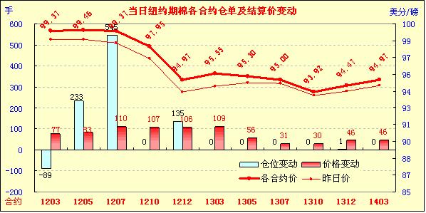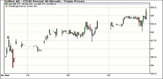 1月23日,紐約期棉因自身基本面利好和外圍市場提振再度收漲,3月合約三連陽,達(dá)到10周新高;因中國正值春節(jié)假期,市場交投略顯清淡。當(dāng)日市場小幅低開,近期3月合約在98.8-99美分之間窄幅震蕩,后一度下滑至98.06美分/磅;接近尾盤時在部分買盤支撐下反彈,3月合約最高至99.44美分/磅,并收于99.37的高位,漲幅為77點;5月合約收于99.46美分/磅,漲83點;其它遠(yuǎn)期合約收漲30-109美分/磅不等。紐約期棉仍受到基本面的支撐,因中國預(yù)測下年度棉花面積大幅縮減。當(dāng)日美元走弱,原油及谷物期貨普遍上漲。