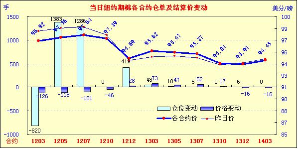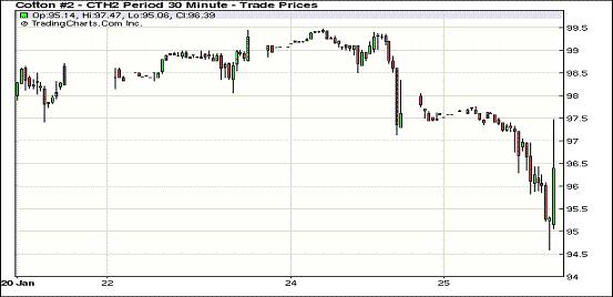 1月25日,紐約期棉連續(xù)第二日走弱,在技術賣盤打壓下,前三個合約盤中接近跌停,并收跌百點以上。當日市場低開低走,在賣盤打壓下一路下滑,近期3月合約分別跌破100日移動平均線96.73美分/磅和21日移動平均線95.25美分/磅,觸發(fā)止損賣盤,導致價格進一步下挫,至當日最低點94.59美分/磅(-359點),接近跌停板;5月合約和7月合約盤中跌幅也超過300點。接近尾盤時有大量買盤涌入市場,促價格反彈并收回部分跌幅,盤終3月合約收于96.92美分/磅,跌126點;5月合約收于97.36美分/磅,跌118點;其它遠期合約漲跌不一。