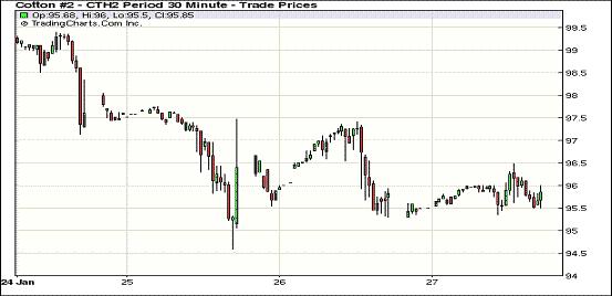 1月27日,紐約期棉受貿(mào)易買盤支持微幅收漲,結(jié)束三連陰局面。當(dāng)日市場(chǎng)小幅低開,上半場(chǎng)窄幅震蕩,近期3月合約最低至95.30美分/磅,接近前一日低點(diǎn)95.29美分/磅。低位有部分貿(mào)易買盤進(jìn)入市場(chǎng),促使價(jià)格反彈,3月合約最高至96.49美分/磅;尾盤時(shí)再度回落,盤終收于95.61美分/磅,漲2點(diǎn);5月合約收于96.09美分/磅,漲5點(diǎn)。