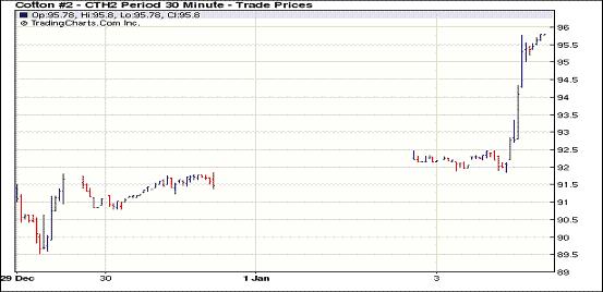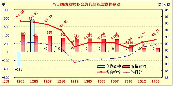 因多國(guó)經(jīng)濟(jì)數(shù)據(jù)好于預(yù)期給市場(chǎng)人氣帶來(lái)提振,紐約期棉在新年首個(gè)交易日跟隨歐美股市及外部大宗商品市場(chǎng)全面走高,主力1203月合約結(jié)算價(jià)95.80美分/磅,漲400點(diǎn),1205月合約結(jié)算價(jià)95.57美分/磅,漲389點(diǎn),其他遠(yuǎn)期合約也普遍大幅收漲。投資者一改節(jié)前的低迷態(tài)勢(shì),成交量大幅增加。當(dāng)日市場(chǎng)小幅高開(kāi),主力1203月合約早盤(pán)在91.57-92.50美分/磅之間窄幅震蕩;午盤(pán)后股市及外部商品市場(chǎng)走高刺激期棉大幅上漲,盤(pán)終該合約于11月中旬以來(lái)首次收于漲停,并達(dá)4周以來(lái)高點(diǎn)。美國(guó)12月制造業(yè)采購(gòu)經(jīng)理人指數(shù)(PMI)從11月份的52.7升至53.9,德國(guó)12月失業(yè)人數(shù)降幅大于預(yù)期,中國(guó)12月官方采購(gòu)經(jīng)理人指數(shù)(PMI)為50.3,高于11月份的49,這令市場(chǎng)對(duì)全球經(jīng)濟(jì)活動(dòng)穩(wěn)步上升的預(yù)期增強(qiáng),股市及大宗商品市場(chǎng)受助全面上漲。基本面上,據(jù)美國(guó)農(nóng)業(yè)部(USDA)最新預(yù)測(cè),印度本年度棉花總產(chǎn)583.15萬(wàn)噸,較上月調(diào)低16.35萬(wàn)噸,這也對(duì)期棉帶來(lái)提振。