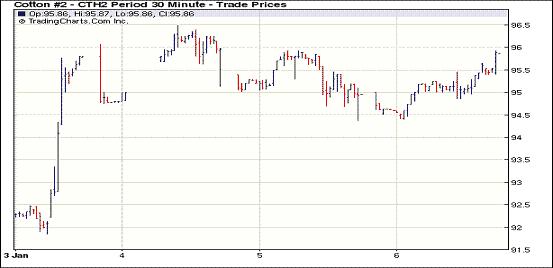 1月6日,紐約期棉市場(chǎng)整體上揚(yáng),近期3月合約收于95.86美分/磅,較前一周上漲112點(diǎn),1205月合約95.52美分,漲104點(diǎn)。雖然前一周美棉本年度陸地棉凈簽約量為負(fù)值,但在投機(jī)買(mǎi)盤(pán)支持下,市場(chǎng)全面收漲,3月合約達(dá)到近6周多來(lái)的高位。當(dāng)日市場(chǎng)平穩(wěn)開(kāi)盤(pán)后略有下跌,3月合約最低跌至94.40美分,低于前一日收盤(pán)水平;盤(pán)中有買(mǎi)盤(pán)介入,該合約在95美分水平得到支撐,交易尾段,雖然外部農(nóng)產(chǎn)品期貨下跌,但期棉保留漲態(tài),近期合約收高百余點(diǎn)。本周以來(lái)投機(jī)買(mǎi)盤(pán)對(duì)市場(chǎng)支撐作用明顯,基本面情況也有利好消息:基本面雖然美棉出口當(dāng)周本年度陸地棉凈簽約量為負(fù)值,但年度來(lái)總簽約量已經(jīng)完成預(yù)測(cè)目標(biāo)的94%,其中多半來(lái)自中國(guó)的采購(gòu);有消息稱巴基斯坦國(guó)有棉花公司將入市采購(gòu),幫助其國(guó)內(nèi)市場(chǎng)擺脫低迷,對(duì)整體市場(chǎng)提升信心有益。
