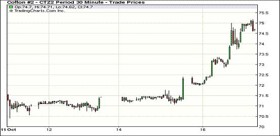 10月16日,紐約期棉繼兩連陽后在投機(jī)買盤支持下全面大幅上揚(yáng)。1212月合約結(jié)算價(jià)74.86美分/磅,漲252點(diǎn);1303月合約結(jié)算價(jià)74.61美分/磅,漲166點(diǎn);其他遠(yuǎn)期合約漲幅在161-188點(diǎn)之間。市場(chǎng)交易活躍,當(dāng)日成交量達(dá)5.5萬手,為6月19日以來最高值。當(dāng)日市場(chǎng)平開高走,主力12月合約受買盤支持一路上揚(yáng),輕松突破75美分/磅阻力位,當(dāng)日最高至75.17美分/磅,盤終收于近一個(gè)月高點(diǎn)。期棉市場(chǎng)在過去三個(gè)交易日連續(xù)上漲,12月合約累計(jì)漲幅超過400點(diǎn)。當(dāng)日外部市場(chǎng)漲跌互現(xiàn)。目前已經(jīng)檢驗(yàn)的美棉新花有一半以上整齊度不滿足要求,投資者擔(dān)心在12月合約的第一交割通知日(11月26日)到來時(shí),符合整齊度的美棉供應(yīng)不足,這在一定程度上對(duì)期棉形成支持。