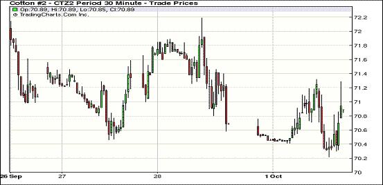 10月1日,紐約期棉全面上揚,近期10月合約結(jié)算價69.71美分/磅,漲56點;主力12月合約結(jié)算價71.20美分/磅,漲55點;其他遠(yuǎn)期合約漲幅16-52點不等。ICAC下調(diào)全球棉花期末庫存對市場形成支持。當(dāng)日市場平穩(wěn)開盤,主力12月合約當(dāng)日最高至71.32美分/磅,震蕩幅度110點。期棉在過去8個交易日中有6個交易日走低,12月合約上周五(9月29日)跌至70.65美分/磅,為近8周最低點。本周一的反彈回補了部分跌幅。當(dāng)日外部市場漲跌互現(xiàn),大豆及小麥?zhǔn)袌龃蠓叩?,玉米及原油市場走強。國際棉花咨詢委員會(ICAC)公布最新預(yù)測,與上個月相比,全球棉花期初庫存調(diào)減90萬包,產(chǎn)量調(diào)增130萬包,消費調(diào)增150萬包,期末庫存調(diào)減80萬包,至7220萬包,此消息促使市場猜測美國農(nóng)業(yè)部(USDA)在其10月份的報告中也將調(diào)低全球期末庫存,這在一定程度上對期棉形成支持。