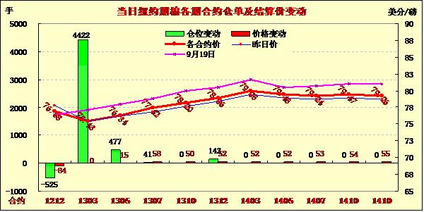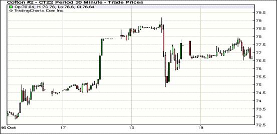 10月19日,紐約期棉近跌遠(yuǎn)漲,近期12月合約收于76.88美分/磅,跌84點;1303合約75.43美分/磅,不變;其他遠(yuǎn)期合約普遍普遍小幅或中幅收漲。市場成交量較前兩日明顯回落。當(dāng)日期棉市場平穩(wěn)開盤,主力合約早盤震蕩上行,當(dāng)日最高至77.92美分;后受基金及商業(yè)多頭獲利平倉打壓,該合約回吐全部漲幅,盤終中幅收跌。12/3月合約價差由229點縮小至145點。當(dāng)周主力12月合約累計漲552點,漲幅7.7%;3月合約累計漲352點,漲幅4.9%。本周前期,因市場擔(dān)心在12月合約第一交個通知日(11月26日)前滿足期棉要求的美棉供應(yīng)不足,期棉市場受支持連續(xù)上揚。最新的美棉檢驗結(jié)果顯示,目前已檢驗新中中符合要求的比例達(dá)到50.3%,此前一周為47.4%,這使擔(dān)憂情緒回落,多頭獲利平倉打壓近月合約走低。