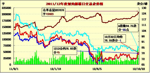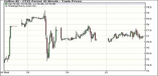 10月22日,紐約期棉缺乏方向指引呈橫盤整理格局,1212月合約結(jié)算價76.93美分/磅,漲5點;1303月合約結(jié)算價75.38美分/磅,跌5點;其他遠期合約普遍微幅收漲。市場繼續(xù)關注美棉分檢及采摘進度。當日市場平穩(wěn)開盤,主力12月合約在買賣雙方角力下波動較為頻繁,當日最高至77.63美分/磅,較前一周的高點有所回落,盤終該合約微幅收漲。12/3月合約價差由155點縮小至145點。當日外部大豆及小麥市場收漲,玉米及原油收跌。上周在美棉近期可交割資源不足及紐期登記庫存偏少的支持下,ICE期棉主力勁漲7.7%。后美棉分檢情況有所改善,加之基本面疲軟持續(xù)對市場形成壓力,期棉上漲難以繼續(xù)。市場繼續(xù)對美棉分檢及采摘進度保持密切關注。