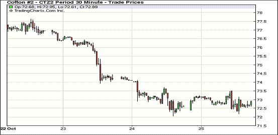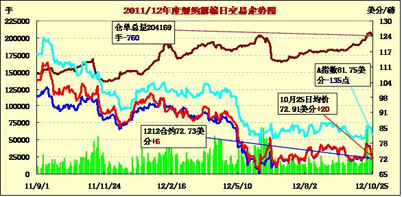 10月25日,紐約期棉在連續(xù)兩日大幅走低之后橫盤整理,小幅收漲。1212月合約結(jié)算價72.73美分/磅,漲6點(diǎn);1303月合約結(jié)算價72.97美分/磅,漲45點(diǎn);其他遠(yuǎn)期合約也普遍中幅收漲。市場交易量較前兩日有所回落。當(dāng)日期棉開盤較為平穩(wěn),上周美棉出口數(shù)據(jù)不佳拖累各合約震蕩走低;市場擔(dān)心颶風(fēng)Sandy可能對美國東南棉區(qū)新花造成損害,此外目前美棉已加工數(shù)量同比落后13%,這些因素對市場形成支持,主力12月合約盤終微幅上揚(yáng),其他合約中幅收漲。投資者將倉位移至1303或其他遠(yuǎn)期合約,價差交易活躍。當(dāng)日外部谷物市場普遍走低,原油期貨收高。據(jù)美國農(nóng)業(yè)部(USDA),10.12-10.18一周美國凈簽約出口12/13年度陸地棉7824噸,裝運(yùn)13880噸(較前一周減26%,較近四周平均值減58%)。颶風(fēng)Sandy在未來幾日可能對美國東南棉區(qū)的新花造成一定損害,市場保持關(guān)注。