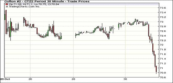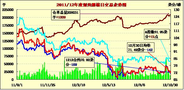 10月30日,受基金賣盤打壓,市場全面收跌,成交量增加。近期12月合約結算價70.92美分/磅,跌169點,1303月合約72美分,跌119點。市場當日行情整體呈下跌趨勢。早盤12月合約在73美分一線窄幅波動,盤中跌破72美分后失去支撐,跌勢加快,最終收于71美分之下。11月26日為近期12月合約第一個交割通知日,指數基金賣盤將頭寸從12月合約移至3月及其他合約,對近期合約形成打壓。據報道,颶風“桑迪”尚未對美棉產量產生不利影響,僅局部棉花質量受損,對期棉市場支撐有限。當日因移倉交易活躍,市場成交量增加。隨著美棉上市量增加,期棉登記庫存量將逐步增多。