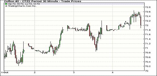 10月4日,在美棉出口銷售情況利好及印度產(chǎn)量調(diào)增的雙重作用下,紐約期棉近跌遠(yuǎn)漲,近期10月合約結(jié)算價(jià)70.40美分/磅,跌14點(diǎn);主力12月合約結(jié)算價(jià)72.09美分/磅,跌7點(diǎn);其他遠(yuǎn)期合約普遍小幅收漲。受美棉出口周報(bào)提振,期棉開盤后一路震蕩上揚(yáng),主力12月合約超過前一日高點(diǎn),當(dāng)日最高至72.65美分/磅;尾盤時(shí)分印度棉花總產(chǎn)提高對(duì)期棉形成壓力,該合約回落繪圖全部漲幅,盤終微幅收跌。當(dāng)日外部市場(chǎng)多數(shù)收高。上周美棉銷售情況利好,至9月27日,美棉簽約出口量已達(dá)到預(yù)計(jì)出口量的49%,實(shí)際裝運(yùn)量約達(dá)25%,這對(duì)市場(chǎng)形成支持;印度棉花咨詢委員會(huì)(CAB)召開會(huì)議,預(yù)計(jì)印度12/13年度棉花總產(chǎn)為2609萬(wàn)包,高于美國(guó)農(nóng)業(yè)部9月份預(yù)計(jì)的2450萬(wàn)包,這在一定程度上對(duì)市場(chǎng)形成打壓。