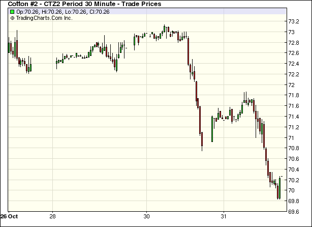 10月最后一個交易日,紐約期棉以下跌收盤,指數(shù)基金對近期12月合約移倉交易為近月合約帶來壓力,該合約結(jié)算價70.07美分/磅,跌85點,本月累計下跌了58點,跌幅0.82%;1303月合約結(jié)算價71.39美分,跌61點。當(dāng)日期棉12月合約平穩(wěn)開盤后因突破72美分高位失敗,延續(xù)前一日弱勢行情繼續(xù)下滑,盤中在70美分獲得支撐,交易后期因指數(shù)基金移倉交易打壓一度跌破該關(guān)鍵支撐位,為近14周以來低位,盤中收平于70美分一線。據(jù)美國農(nóng)業(yè)部報告,截至10月28日,美棉全國平均采摘率達(dá)到50%。隨著新棉上市量增多,期棉市場登記庫存增加,對市場形成壓力。