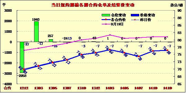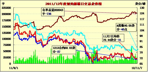11月7日,紐約期棉市場再度全面收跌,近期12月合約跌破70美分,結(jié)算價(jià)69.83美分/磅,跌27點(diǎn),為自7月25日以來低位,1303月合約結(jié)算價(jià)71.07美分,跌17點(diǎn)。歐美經(jīng)濟(jì)狀況令人憂慮,對市場形成壓力。12月合約當(dāng)日交易呈現(xiàn)弱勢狀態(tài),上下波動(dòng)區(qū)間為69.8-70.54美分,波幅74點(diǎn),因歐洲經(jīng)濟(jì)困境以及奧巴馬再次當(dāng)選后依然分裂的國會(huì)均令投資者感到不安,外圍股市、黃金和原油期貨均有所下跌,期棉受拖累跌破支撐位70美分,最終收于近低點(diǎn)。12/3月轉(zhuǎn)倉交易活躍,市場成交增加。