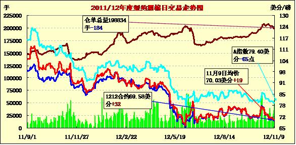11月9日,雖然美國農(nóng)業(yè)部(USDA)報告利空,但期棉市場整體上漲,12月合約結(jié)算價69.58美分/磅,漲32點,1303月合約70.44美分,漲10點。市場交易以12/3月轉(zhuǎn)倉交易為主,成交維持高位。在USDA報告發(fā)布前,主力3月合約穩(wěn)定于70美分以上運行,報告發(fā)布后市場下跌至該水平以下,當其最低跌至69.79美分后反彈走高,盤終收于70美分以上。分析師指出,市場近期一直預期USDA報告利空,但消息落實后,有空頭平倉對市場形成支持。據(jù)美國農(nóng)業(yè)部(USDA)報告顯示,本年度全球棉花期初庫存1516萬噸,較上次預測調(diào)增2萬噸;產(chǎn)量2544萬噸,較上次預測調(diào)增11萬;消費2315萬,調(diào)減12萬;期末庫存1748萬,調(diào)增25萬。