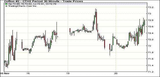 11月20日,紐約期棉市場小幅收漲,近期12月合約結(jié)算價(jià)72.50美分/磅,漲45點(diǎn),主力3月合約72.49美分,漲43點(diǎn)。市場缺乏足夠多空炒作因素,盤中前兩份合約交易主要圍繞72美分波動(dòng)。當(dāng)日主力3月合約穩(wěn)定開盤后短暫跌破72美分,盤中圍繞該水平窄幅波動(dòng),交易后期反彈走高,盤終收于近高點(diǎn)。 美10月新屋開建數(shù)字意外攀升,抵消了惠普公司會(huì)計(jì)欺詐事件的影響;伯南克警告國會(huì)議員應(yīng)達(dá)成協(xié)議、消除有關(guān)財(cái)政懸崖的不確定性因素,美國股市走高,谷物期貨市場也以上漲收盤,期棉聯(lián)動(dòng)收漲。