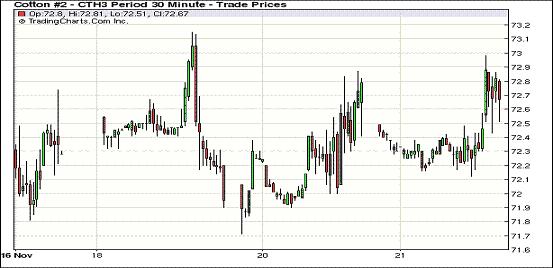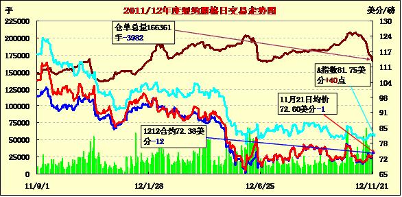 感恩節(jié)假期前,11月21日,紐約期棉市場窄幅波動(dòng),交易仍以12/3月合約轉(zhuǎn)倉為主,近期合約收跌,遠(yuǎn)月合約穩(wěn)中有漲,近期12月合約結(jié)算價(jià)72.38美分/磅,跌12點(diǎn),主力3月合約72.66美分,漲17點(diǎn)。22日市場將因感恩節(jié)假日休市一天,23日恢復(fù)交易。主力3月合約當(dāng)日交易圍繞72-73美分間波動(dòng),大部分交易日主要在72.2-72.6美分震蕩,交易尾段發(fā)力試圖沖破73美分失敗,最終收高十余點(diǎn)。分析指出,市場上行遇到全球高庫存壓力,下行則有美棉下年度面積預(yù)期減少支撐,市場短期內(nèi)仍維持弱勢(shì)震蕩格局。