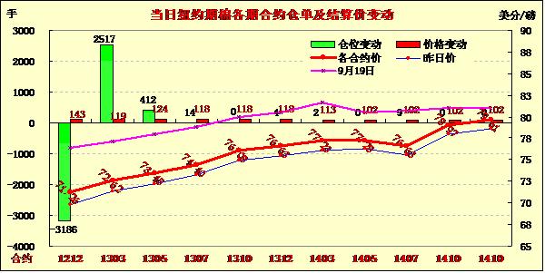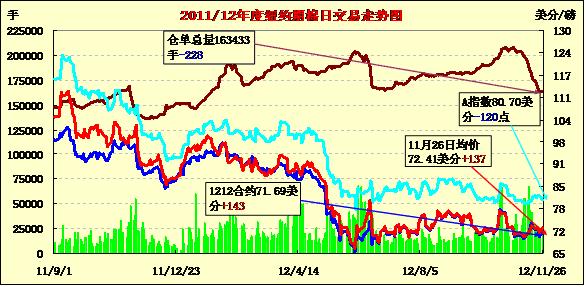 11月26日,紐約期棉強(qiáng)勢(shì)反彈,近期1212月合約結(jié)算價(jià)71.26美分/磅,漲143點(diǎn);主力1303月合約結(jié)算價(jià)72.62美分/磅,漲119點(diǎn);其他遠(yuǎn)期合約漲幅也在百點(diǎn)以上。當(dāng)日市場(chǎng)早盤(pán)運(yùn)行較為平穩(wěn),主力合約主要圍繞71.80美分/磅震蕩。上周五美棉出口周報(bào)數(shù)據(jù)利好雖未對(duì)當(dāng)日市場(chǎng)形成支持,但支撐了周一的市場(chǎng)反彈,外部谷物市場(chǎng)走高及中國(guó)經(jīng)濟(jì)數(shù)據(jù)利好也對(duì)期棉形成支持,該合約后半場(chǎng)一路上揚(yáng),最高至72.98美分/磅,尾盤(pán)雖有所回落但仍以大漲收盤(pán)。當(dāng)日外部谷物商品市場(chǎng)普遍走高,原油期貨走低。近期12月合約進(jìn)入第一交割通知日,尚有未平倉(cāng)合約1154張。分析指出,上周五公布的美棉出口周報(bào)的利好影響在周一反映出來(lái)。此外,中國(guó)11月制造業(yè)加速擴(kuò)張,數(shù)據(jù)顯示,11月匯豐制造業(yè)采購(gòu)經(jīng)理人指數(shù)(PMI)13個(gè)月以來(lái)首次升至榮枯線上方,再次印證了中國(guó)經(jīng)濟(jì)見(jiàn)底并回升,這對(duì)期棉市場(chǎng)形成支持。