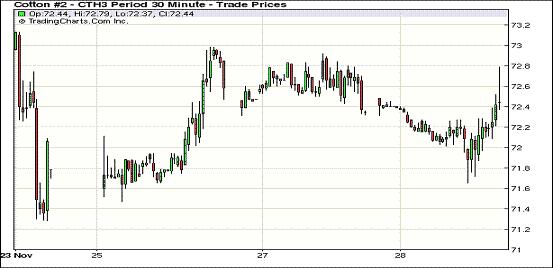 11月28日,紐約期棉市場多漲少跌,近期12月合約結(jié)算價(jià)71.23美分/磅,漲19點(diǎn),主力3月合約72.63美分,漲11點(diǎn)。美國經(jīng)濟(jì)方面有利好消息,促進(jìn)主力合約先跌后漲。當(dāng)日3月合約平穩(wěn)開盤后震蕩下行,盤中試圖在72美分找到支撐,但因缺乏買盤跌破這一水平,最低位71.65美分(-87點(diǎn)),后在美國政壇領(lǐng)袖的樂觀講話推動(dòng)下,市場反彈走高,3月合約重回72美分以上。