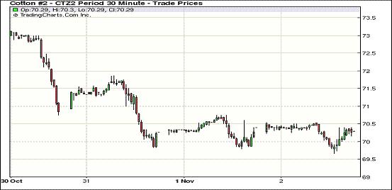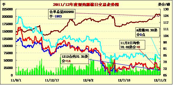 11月2日,紐約期棉市場低部小幅波動,漲跌互現(xiàn),12月合約結算價70.35美分/磅,漲14點,1303月合約71.44美分,跌6點。外部商品市場因美元上漲整體承壓,期棉亦有壓力,市場交易以近期12月合約轉倉交易為主。與前兩個交易日相同,2日12月合約在70美分一線窄幅波動,當其盤中跌破70美分后因技術性買盤反彈,終收于該支撐位以上,其他合約波幅不大,多數(shù)微跌。12月合約跌至70美分,現(xiàn)貨市場詢盤增加,對近期合約形成支持。據(jù)美國農業(yè)部(USDA)報告,10.19-25日一周美國凈簽約出口本年度陸地棉21954噸,較前一周增加1.8倍,但較近四周平均低36%;裝運25106噸,較前一周增加81%,但較近四周平均低10%;簽約出口本年度皮馬棉658噸、裝運4173噸;凈簽約出口2013/14年度陸地棉839噸。