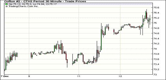 12月12日,受美國聯(lián)邦儲備委員會宣布擴大刺激政策提振,紐約期棉延續(xù)前一日的漲勢繼續(xù)走高,主力1303月合約結算價75.12美分/磅,漲22點;1305月合約結算價76.00美分/磅,漲21點。當日期棉前半場平穩(wěn)運行,主力合約震蕩區(qū)間上行至74.8-75之間,后美聯(lián)儲公布刺激政策打壓美元走低,商品市場普遍走高,該合約受支持輕松突破長期阻力位75美分/磅,盤終自10月22日以來首次收于75美分之上。其他合約也普遍小幅收漲。美國聯(lián)邦儲備委員會(簡稱Fed)宣布擴大債券購買計劃,并且公布了針對通貨膨脹率和失業(yè)率的新目標,這一措施對期棉市場形成提振,主力1303月合約突破75美分長期阻力位,可能在未來幾日吸引更多買盤。
