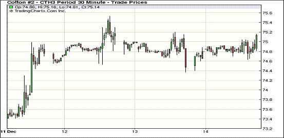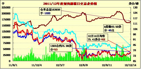 12月14日,受美元走低、外部商品市場普遍走高支持,紐約期棉各合約中幅反彈,近期12月合約收于73.79美分/磅,漲24點;1303合約75.09美分/磅,漲53點;1305月合約結(jié)算價76.04美分/磅,漲53點;其他遠期合約漲幅48-76點不等。當日市場大部分時間圍繞74.85美分一線振幅震蕩,尾盤時分在美元走低、外部商品市場走高的支持下,非商業(yè)買盤入市促期棉反彈走高,主力合約再次突破75美分阻力位,盤終收于75美分之上。當周主力1303月合約累計漲39點;1305月合約漲52點。