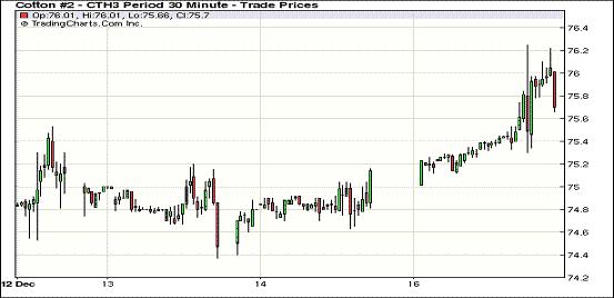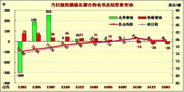 12月17日,雖然外部商品市場整體走弱,但紐約期棉在商業(yè)買盤支持下多數(shù)合約繼續(xù)收漲,主力1303月合約結(jié)算價(jià)75.85美分/磅,漲76點(diǎn);1305月合約結(jié)算價(jià)76.66美分/磅,漲62點(diǎn)。當(dāng)日市場低開高走,商業(yè)買盤強(qiáng)勁促主力合約一路上揚(yáng),午盤后突破76美分,當(dāng)日最高至76.25美分/磅,尾盤時(shí)買盤獲利平倉回吐部分漲幅,盤終該合約收于9月20日以來最高點(diǎn)。除最后兩份合約外,其他合約也小幅或中幅收漲。分析認(rèn)為,期棉收漲主要受以下兩個(gè)因素的支持;一,市場預(yù)期下年度全球植棉面積縮減;二,目前全球經(jīng)濟(jì)已經(jīng)見底,今后有望觸底反彈。主力1303月合約有望挑戰(zhàn)78美分阻力位。