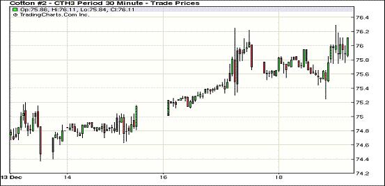 12月18日,紐約期棉近漲遠(yuǎn)跌,主力1303月合約結(jié)算價(jià)75.95美分/磅,漲10點(diǎn);1305月合約結(jié)算價(jià)76.73美分/磅,漲7點(diǎn)。市場(chǎng)成交量在一萬余手徘徊。市場(chǎng)略有低開,主力合約上半場(chǎng)圍繞75.70美分/磅上下震蕩,午盤后商業(yè)買盤入市促該合約走高,再次突破76美分阻力位,當(dāng)日最高至76.29美分/磅;盤終前四份合約微幅收漲,其他遠(yuǎn)期合約微幅或小幅收跌。外部大豆及玉米期貨收跌,小麥及原油收漲。