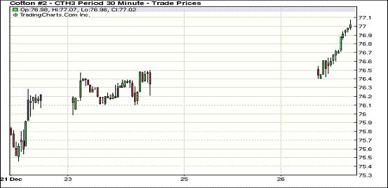 12月26日,雖然外部谷物市場全線下挫,但紐約期棉在買盤支持下連續(xù)第三個交易日上揚(yáng),主力1303月合約結(jié)算價77.06美分/磅,漲66點(diǎn);1305月合約結(jié)算價77.58美分/磅,漲61點(diǎn);其他遠(yuǎn)期合約漲幅23-59點(diǎn)不等。市場在圣誕節(jié)及元旦之間交投清淡,成交量不足萬手。 當(dāng)日市場延遲開市,主力1303月合約平開高走,震蕩區(qū)間67點(diǎn),較此前一個交易日擴(kuò)大16點(diǎn),盤終收于9月7日以來最高值。期棉市場將于1月1日閉市一天,投資者在兩個假期之間普遍持觀望態(tài)度,市場交易處于低位。自11月下旬以來,受美棉簽約出口利好等因素支持,紐約期棉持續(xù)上揚(yáng),主力合約累計漲幅約10%。近期基本面的弱態(tài)對市場影響不大,投資者預(yù)期下年度植棉面積減少及對經(jīng)濟(jì)觸底反彈的預(yù)期促使期棉持續(xù)走高。