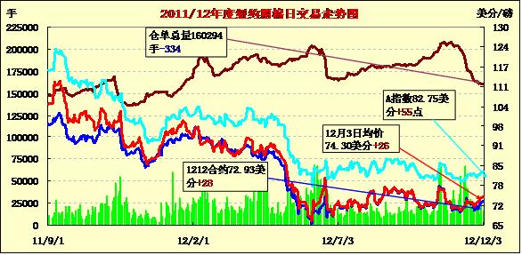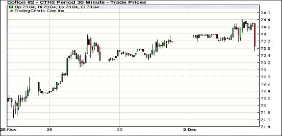 12月3日,受澳大利亞、巴西等產棉國植棉面積大幅下降及空頭平倉支持,紐約期棉前七份合約繼續(xù)收漲,近期1212月合約結算價72.93美分/磅,漲28點;主力1303月合約結算價73.98美分/磅,漲7點。當日市場早盤運行較為平穩(wěn),主力合約主要圍繞73.90美分/磅震蕩。后市場炒作澳大利亞及巴西新花植棉面積大減,此外趨勢跟蹤基金及指數(shù)基金空頭平倉也對市場形成支持,該合約突破74美分/磅阻力位,當日最高至74.41美分/磅;尾盤時分買盤獲利平倉致市場高位回落,該合約未能守住漲勢,但盤終仍微幅收高并處于近五周高位。當日外部谷物商品除小麥外也普遍收高。澳大利亞2012/13年度植棉面積同比縮減30%,巴西植棉面積也大幅下降,產量同比減27%,至630萬包,低于美國農業(yè)部(USDA)11月份預測數(shù)據。