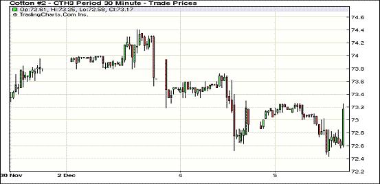 12月5日,受外圍谷物商品市場普遍走高支持,紐約期棉小幅反彈,近期1212月合約結(jié)算價72.04美分/磅,漲13點;主力1303月合約結(jié)算價73.04美分/磅,漲13點。市場成交處于低位。當日主力合約在72.43-73.26美分之間窄幅震蕩,市場開盤后延續(xù)前一日的跌勢一路走低,尾盤時分外部谷物市場走高帶動期棉反彈,該合約盤終重回73美分之上。在過去的15個交易日中,主力1303月合約有11個交易日收漲。近期美棉出口情況利好對期棉市場形成支持,但疲軟的基本面將隨時對市場造成壓力。