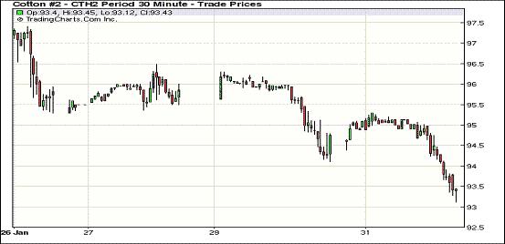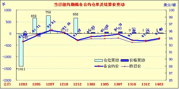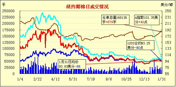 1月31日,外部大宗商品市場漲跌互現(xiàn),紐約期棉在賣盤打壓下近跌遠(yuǎn)漲,主力1203月合約結(jié)算價(jià)93.25美分/磅,跌90點(diǎn),1205月合約結(jié)算價(jià)94.51美分/磅,跌36點(diǎn)。市場交易活躍,成交量超過3萬手。當(dāng)日市場早盤受鄭棉期貨上漲支撐小幅高開,主力合約震蕩上行至當(dāng)日高點(diǎn)95.29美分/磅;午盤后因美元走強(qiáng)及歐美股市走低拖累,該合約回落至當(dāng)日低點(diǎn)93.11美分/磅,震蕩幅度218點(diǎn);尾盤略有反彈,盤終該合約大幅告跌,達(dá)1月份新低。外部大豆、小麥及玉米期貨走高,原油期貨走低。各方目前將關(guān)注點(diǎn)轉(zhuǎn)移到棉花春季種植意向上,據(jù)悉美國棉花協(xié)會(huì)將于本周五公布其2012年棉花種植面積預(yù)測報(bào)告。